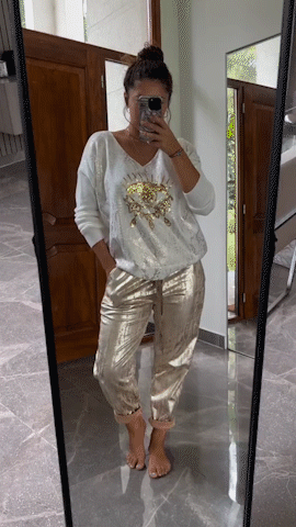 Shine bright like a diamond! 💫 Elevate your style with our Fashionable Evil Eye Gold Foil Top and Glittering Pants Set!!!