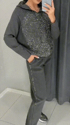 Elevate your casual style with this dazzling Women’s Casual Diamond Embellished Hooded Track Suit. Designed for comfort and glamour, this two-piece set features a relaxed fit hoodie with sparkling diamond embellishments that add a touch of luxe to your everyday look. The matching track pants include shimmering accents along the sides, giving your outfit a chic, coordinated feel.